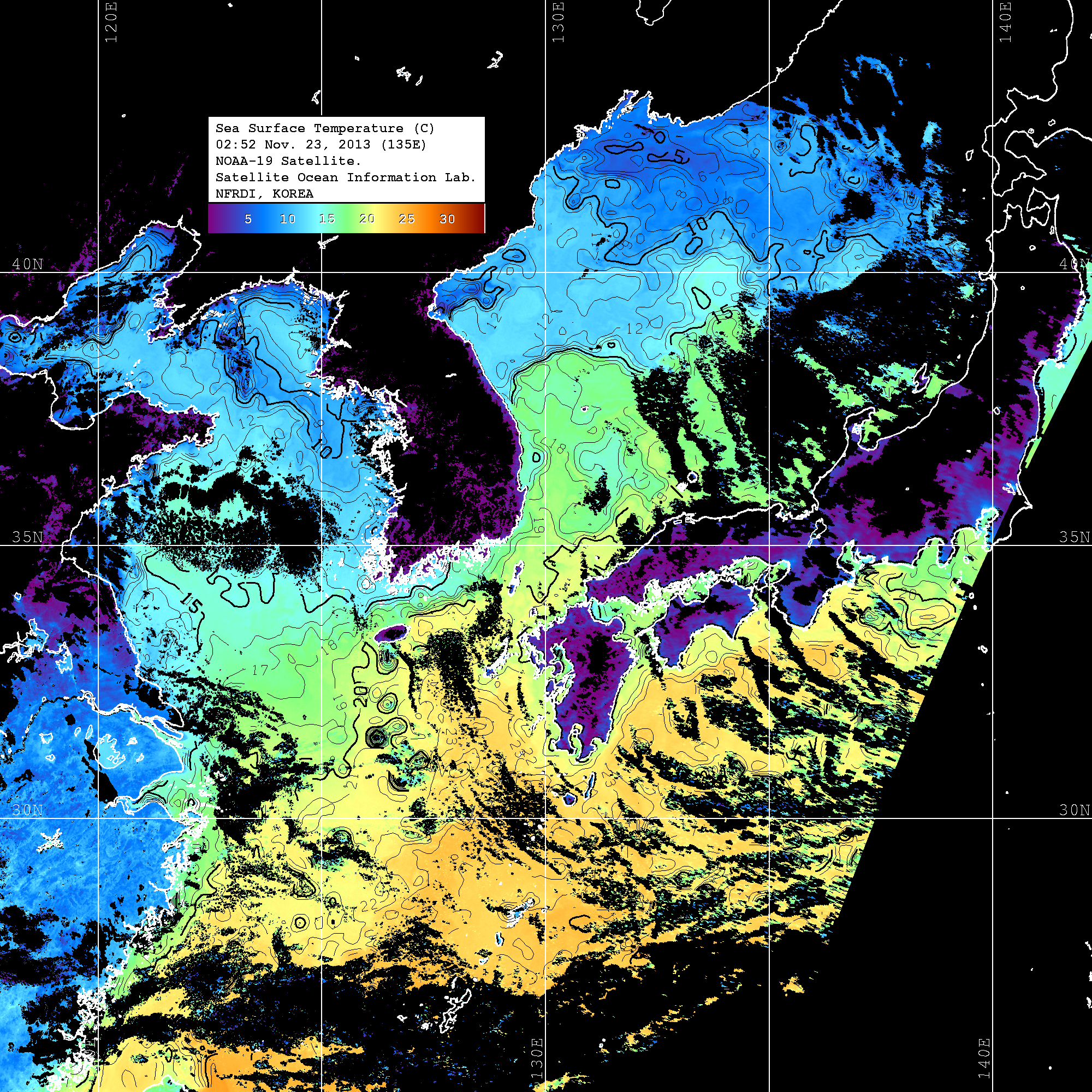 o 2013년 11월 23일 NOAA 위성영상입니다. o 영상 시간 및 수온분포는 범례를 참고하시기 바랍니다. o 검은색은 구름을 나타냅니다. o 그림을 클릭하시면 크게 보실 수 있습니다.