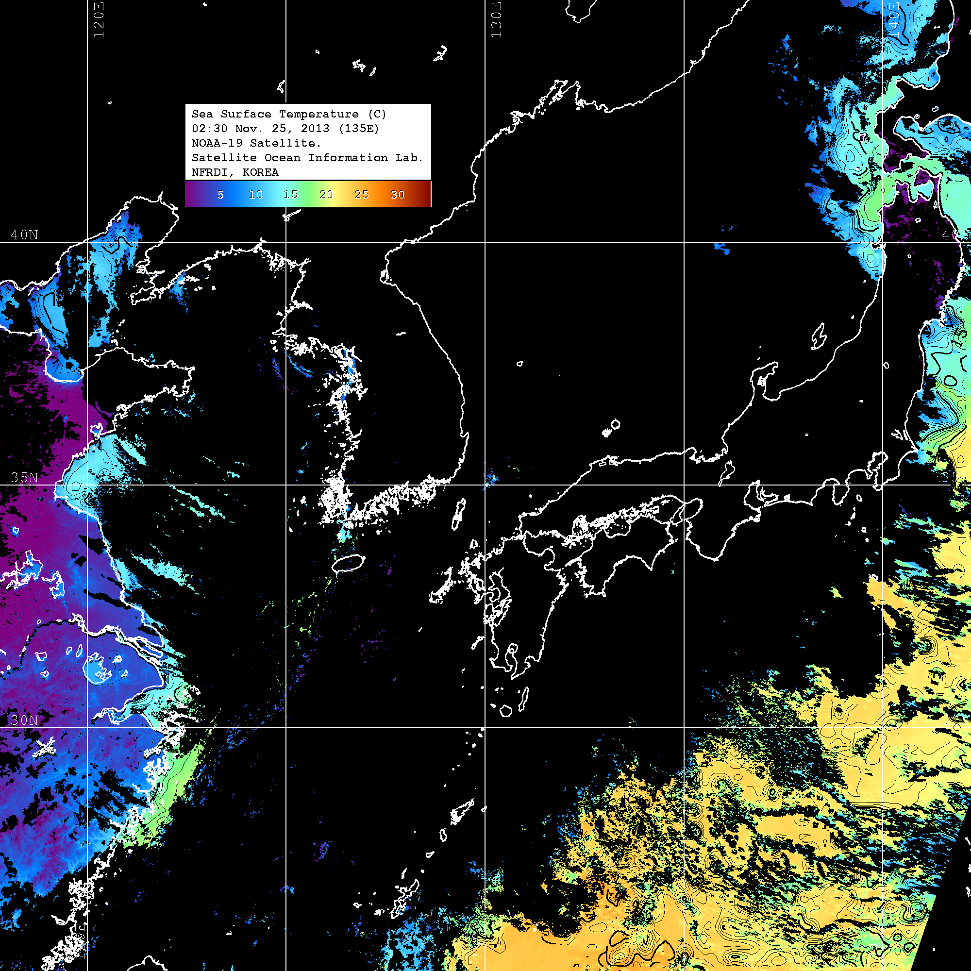 o 2013년 11월 25일 NOAA 위성영상입니다. o 영상 시간 및 수온분포는 범례를 참고하시기 바랍니다. o 검은색은 구름을 나타냅니다. o 그림을 클릭하시면 크게 보실 수 있습니다.