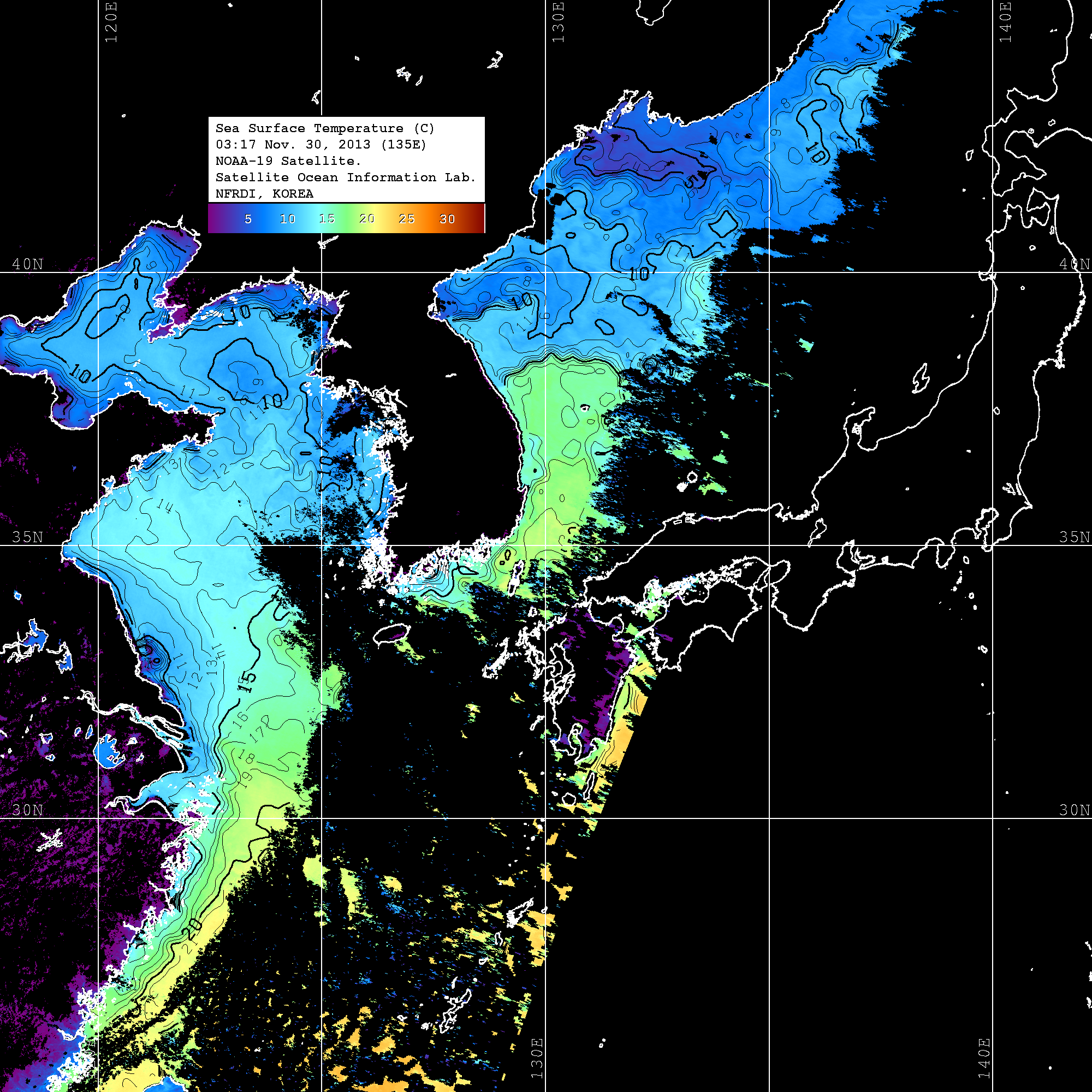 o 2013년 11월 30일 NOAA 위성영상입니다. o 영상 시간 및 수온분포는 범례를 참고하시기 바랍니다. o 검은색은 구름을 나타냅니다. o 그림을 클릭하시면 크게 보실 수 있습니다.