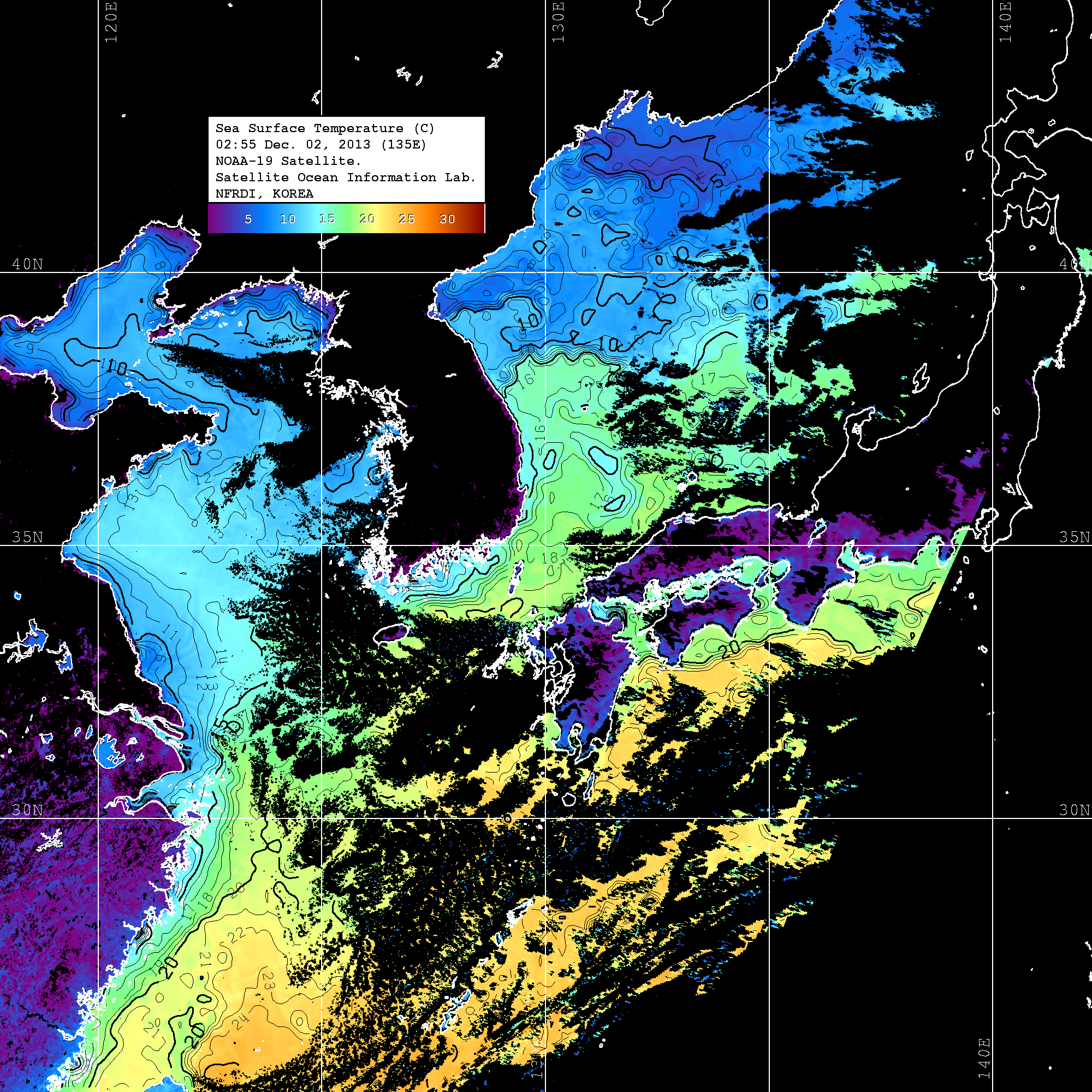o 2013년 12월 02일 NOAA 위성영상입니다. o 영상 시간 및 수온분포는 범례를 참고하시기 바랍니다. o 검은색은 구름을 나타냅니다. o 그림을 클릭하시면 크게 보실 수 있습니다.