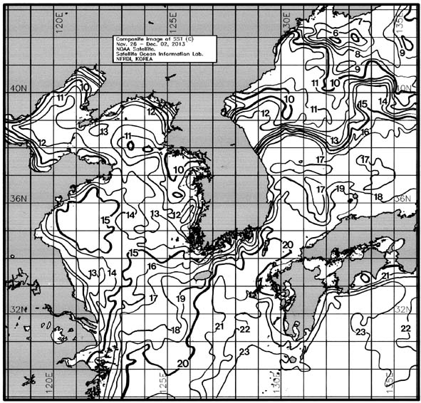 ◦ 금주(2013. 11. 26~2013. 12. 02)의 한국근해 표면수온은 대화퇴 근해 11~12도, 울릉도-독도 근해 17~18도, 대마도 근해 19~20도, 제주도 근해 18~19도, 이어도 근해 17~18도, 가거초 근해 14~15도, 어청도 근해 12~13도, 백령도 근해 10∼11도로 나타납니다. ◦「평년에 비해」대화퇴 근해 1.9도 낮게, 울릉도-독도 근해 0.8도 높게, 대마도 근해 비슷하게, 제주도 근해 1.1도 낮게, 이어도 근해 1도 낮게, 가거초 근해 0.5도 낮게, 어청도 근해 0.9도 낮게 나타납니다. ◦「전년에 비해」대화퇴 근해 비슷하게, 울릉도-독도 근해 0.5도 높게, 대마도 근해 1도 높게, 제주도 근해 비슷하게, 이어도 근해 0.5도 높게, 가거초 근해 2도 높게, 어청도 근해 1도 높게, 백령도 근해 2.5도 낮게 나타납니다. ◦ 수온 전선대는 우리나라 제주해협에서 대한해협까지 17도를 중심으로 형성됩니다. |