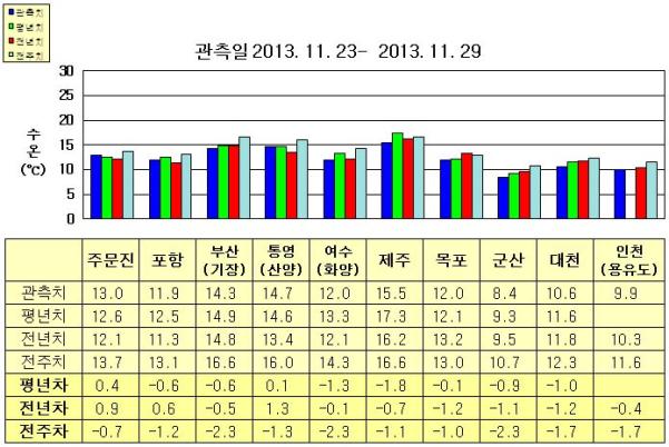 ◦ 금주(2013. 11. 23~2013. 11. 29)의 한반도 연안 표면수온은 동해 연안역에서 섭씨 11.5~14.5도, 남해 연안역 12.0~15.5도, 서해 연안역에서 8~12도로 나타납니다. ◦ 평년에 비해 주문진 0.4도 높음을 제외한 동해 연안역은 0.6도 낮게, 통영(산양) 비슷함을 제외한 남해 연안역은 1~2도 낮게, 목포 비슷함을 제외한 서해 연안역은 0.5~1.0도 낮게 나타납니다. ◦ 전년에 비해 부산(기장) 0.5도 낮음을 제외한 동해 연안역은 0.5~1.0도 높게, 남해 연안역은 통영(산양) 1.3도 높게, 여수(화양) 비슷하게, 제주 0.7도 낮게 나타나며, 서해 연안역은 0.5~1.5도 낮게 나타납니다. |