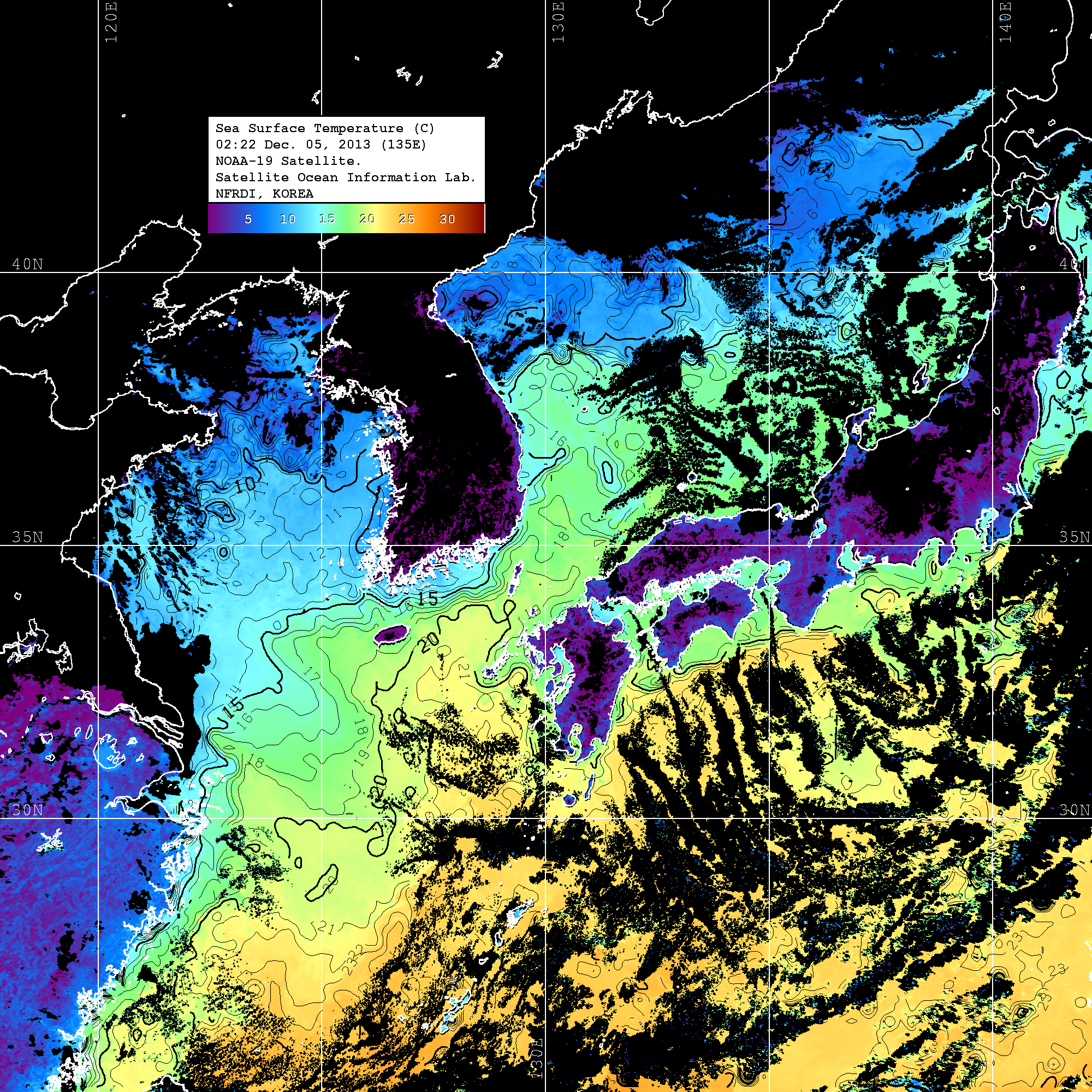 o 2013년 12월 05일 NOAA 위성영상입니다. o 영상 시간 및 수온분포는 범례를 참고하시기 바랍니다. o 검은색은 구름을 나타냅니다. o 그림을 클릭하시면 크게 보실 수 있습니다.