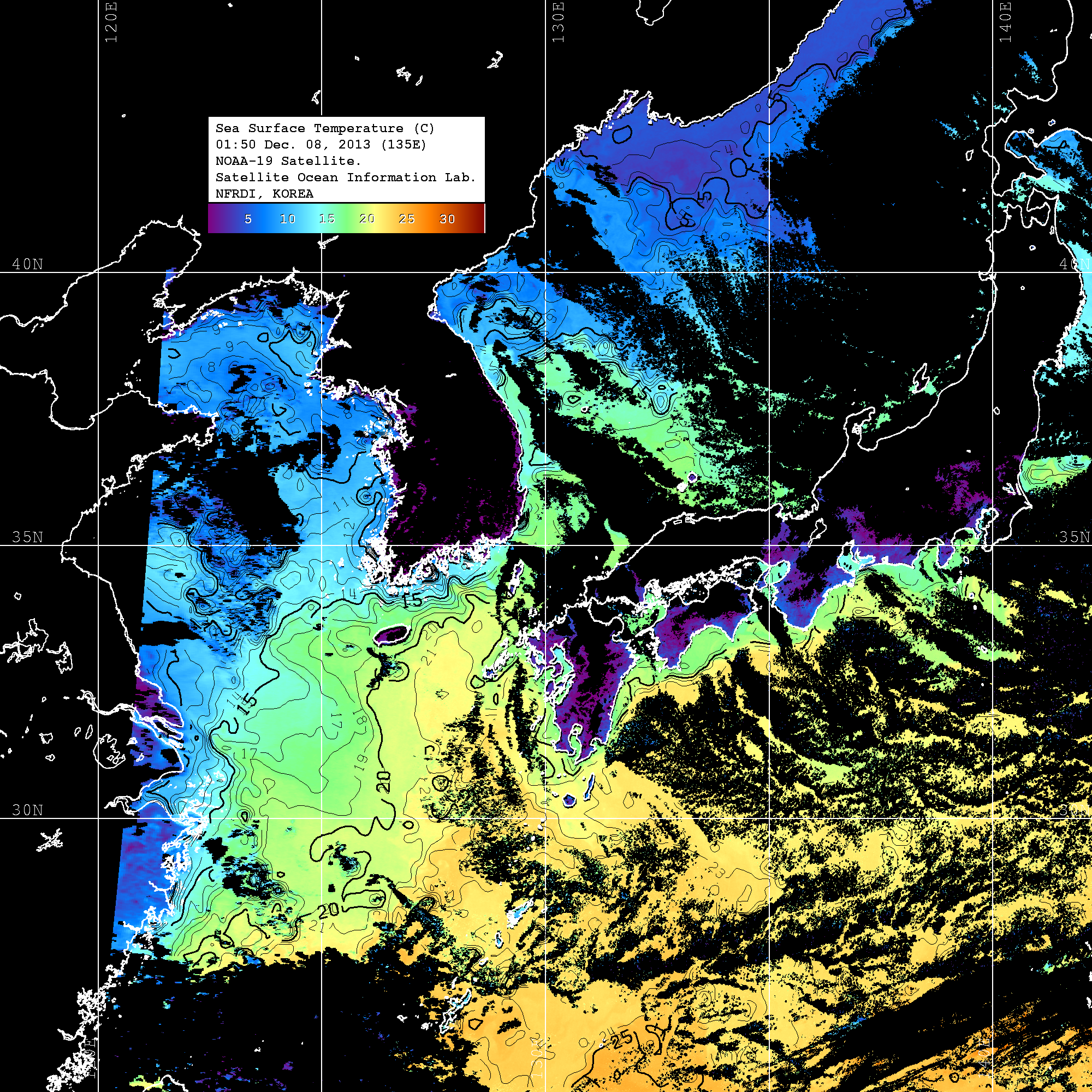 o 2013년 12월 08일 NOAA 위성영상입니다. o 영상 시간 및 수온분포는 범례를 참고하시기 바랍니다. o 검은색은 구름을 나타냅니다. o 그림을 클릭하시면 크게 보실 수 있습니다.