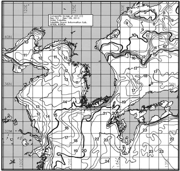 ◦ 금주(2013. 12. 03~2013. 12. 09)의 한국근해 표면수온은 대화퇴 근해 11~12도, 울릉도-독도 근해 16~17도, 대마도 근해 19~20도, 제주도 근해 19~20도, 이어도 근해 16~17도, 가거초 근해 15~16도, 어청도 근해 11~12도, 백령도 근해 11∼12도로 나타납니다. ◦「평년에 비해」대화퇴 근해 0.9도 낮게, 울릉도-독도 근해 0.5도 높게, 대마도 근해 0.4도 높게, 제주도 근해 0.6도 높게, 이어도 근해 0.8도 낮게, 가거초 근해 1.6도 높게, 어청도 근해 비슷하게 나타납니다. ◦「전년에 비해」대화퇴 근해 0.5도 낮게, 울릉도-독도 근해 1도 높게, 대마도 근해 2도 높게, 제주도 근해 2.5도 높게, 이어도 근해 1도 높게, 가거초 근해 2도 높게, 어청도 근해 0.5도 높게, 백령도 근해 2도 높게 나타납니다. ◦ 수온 전선대는 우리나라 제주해협에서 대한해협까지 18도를 중심으로 형성됩니다. |