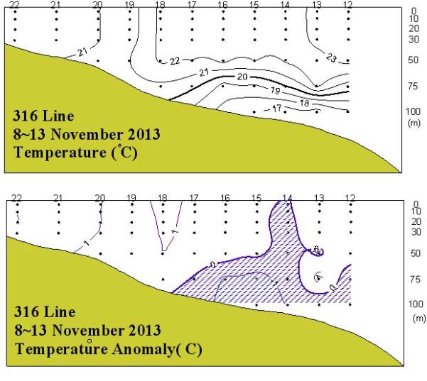 ◦ 2013년 11월 8∼13일 국립수산과학원 수산해양종합정보과에서 조사한 동중국해 북부해역(316선)의 수온 수직분포도와 평년편차도입니다. ◦ 20℃를 중심으로 한 수온약층은 수심 50∼100m에서 형성되었고 관측 해역 내에서 동쪽이 서쪽에 비해 수온이 높게 나타났습니다. ◦ 평년에 비하여 정점 13∼17사이의 일부해역을 제외한 대부분의 해역에서 1℃ 내외의 고온현상을 나타났습니다. =$row['content']?> =$row['content']?> =$row['content']?> |