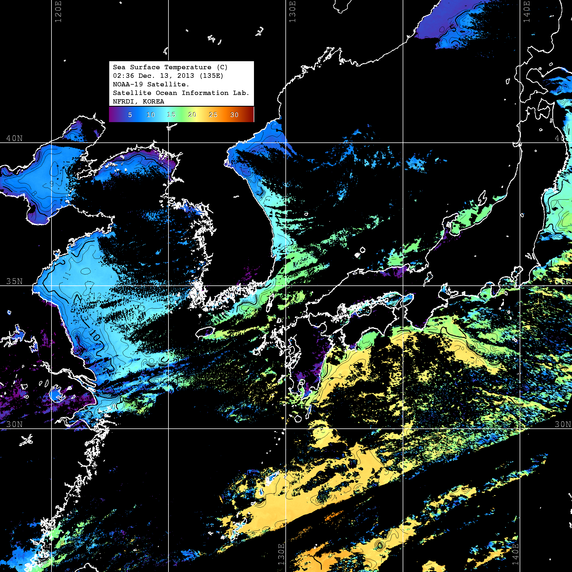 o 2013년 12월 13일 NOAA 위성영상입니다. o 영상 시간 및 수온분포는 범례를 참고하시기 바랍니다. o 검은색은 구름을 나타냅니다. o 그림을 클릭하시면 크게 보실 수 있습니다.