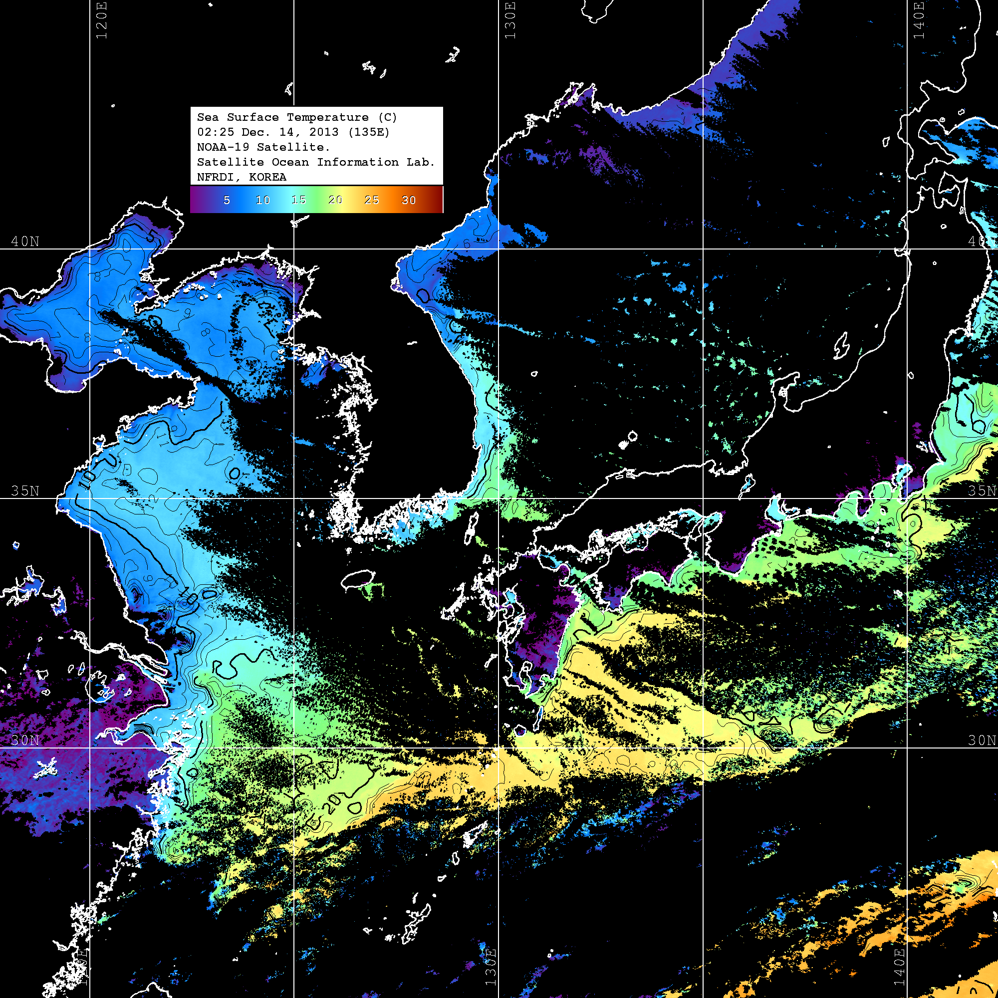 o 2013년 12월 14일 NOAA 위성영상입니다. o 영상 시간 및 수온분포는 범례를 참고하시기 바랍니다. o 검은색은 구름을 나타냅니다. o 그림을 클릭하시면 크게 보실 수 있습니다.