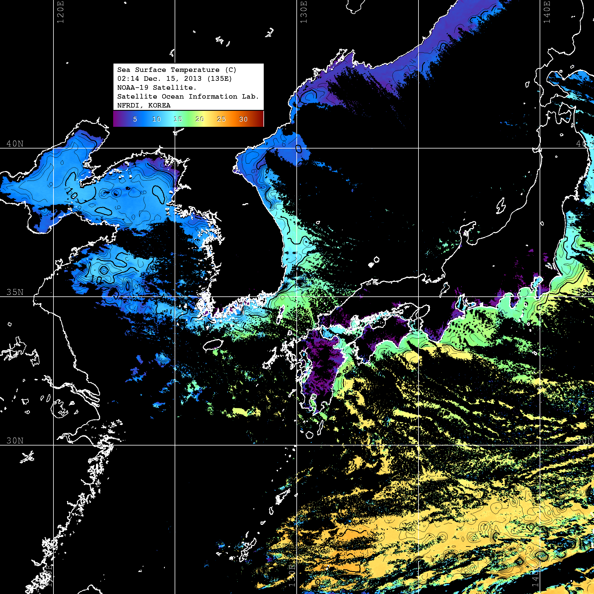 o 2013년 12월 15일 NOAA 위성영상입니다. o 영상 시간 및 수온분포는 범례를 참고하시기 바랍니다. o 검은색은 구름을 나타냅니다. o 그림을 클릭하시면 크게 보실 수 있습니다.