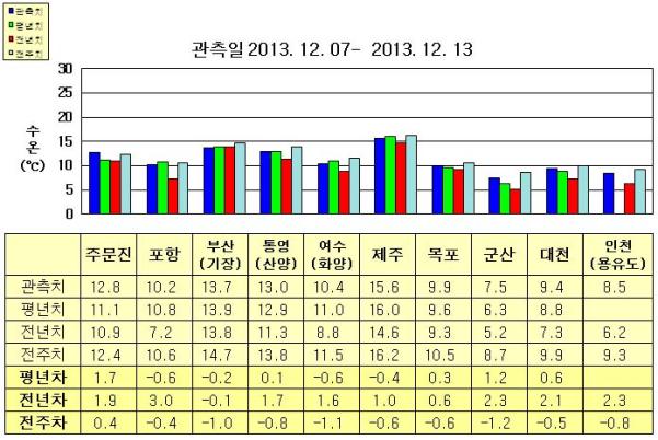 ◦ 금주(2013. 12. 07~2013. 12. 13)의 한반도 연안 표면수온은 동해 연안역에서 섭씨 10~14도, 남해 연안역 10~16도, 서해 연안역에서 7.5~10.0도로 나타납니다. ◦ 평년에 비해 동해 연안역은 주문진 1.7도 높게, 포항 0.6도 낮게, 부산(기장) 비슷하게 나타나며, 통영(산양) 비슷함을 제외한 남해 연안역은 0.5~1.0도 낮게, 목포 비슷함을 제외한 서해 연안역은 0.5~1.5도 높게 나타납니다. ◦ 전년에 비해 부산(기장) 비슷함을 제외한 동해 연안역은 1.5~3.0도 높게, 남해 연안역은 1~2도 높게, 서해 연안역은 0.5~2.5도 높게 나타납니다. |