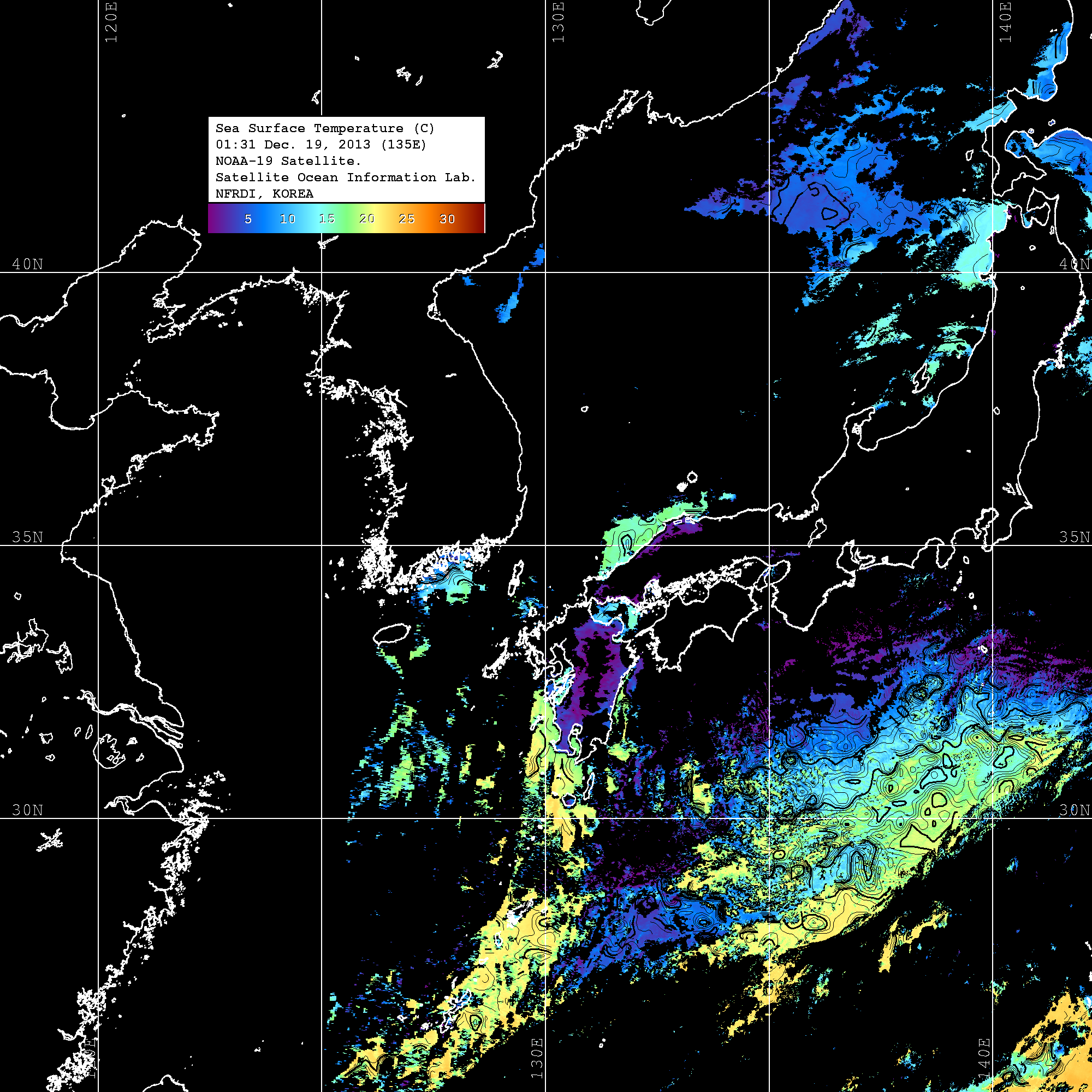 o 2013년 12월 19일 NOAA 위성영상입니다. o 영상 시간 및 수온분포는 범례를 참고하시기 바랍니다. o 검은색은 구름을 나타냅니다. o 그림을 클릭하시면 크게 보실 수 있습니다.