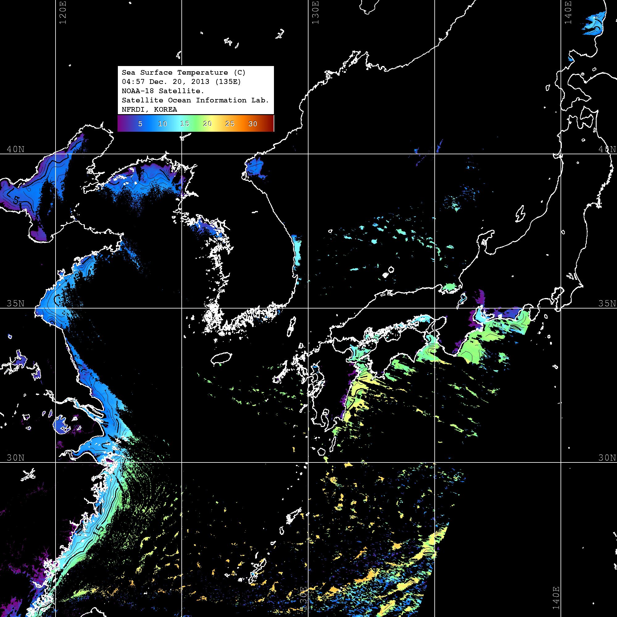 o 2013년 12월 20일 NOAA 위성영상입니다. o 영상 시간 및 수온분포는 범례를 참고하시기 바랍니다. o 검은색은 구름을 나타냅니다. o 그림을 클릭하시면 크게 보실 수 있습니다.