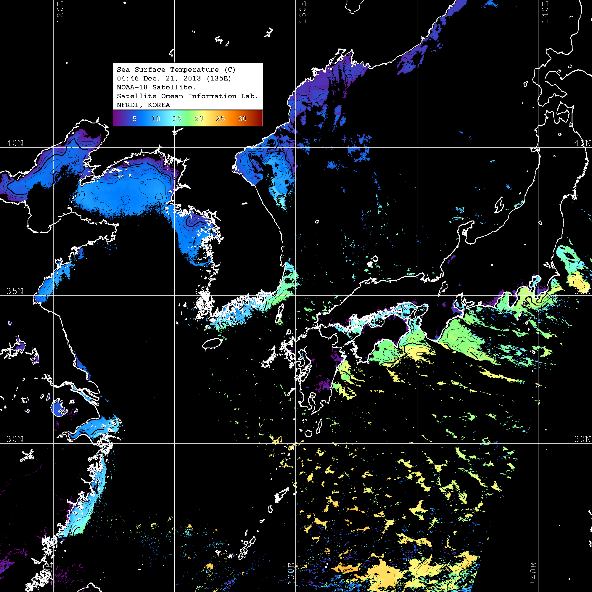 o 2013년 12월 21일 NOAA 위성영상입니다. o 영상 시간 및 수온분포는 범례를 참고하시기 바랍니다. o 검은색은 구름을 나타냅니다. o 그림을 클릭하시면 크게 보실 수 있습니다.