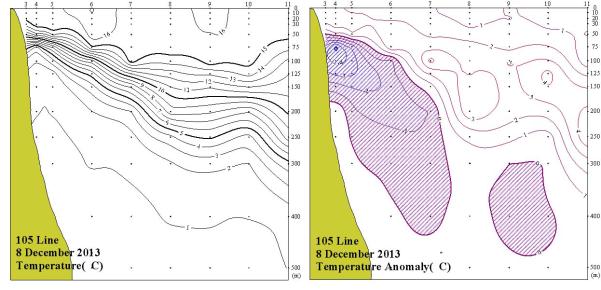 ◦ 2013년 12월 8일 국립수산과학원 동해수산연구소에서 조사한 105선(동해 동방)의 수직수온분포도 및 평년편차도입니다. ◦ 10℃를 중심으로 한 수온약층이 연안역에서 50∼125m 부근, 외해에서 75∼250m 부근에서 형성되었으며, 연안에서 외해로 갈수록 수온약층 형성수심이 깊어졌습니다. ◦ 평년에 비하여 정점 3∼7사이에서 수심 75m부터 400m까지와 정점 8∼10사이에서 수심 300m부터 500m까지 4℃내외의 저온현상을 보 였으며, 이를 제외한 나머지 해역과 수층에서는 3℃내외의 고온현상을 보였습니다. |