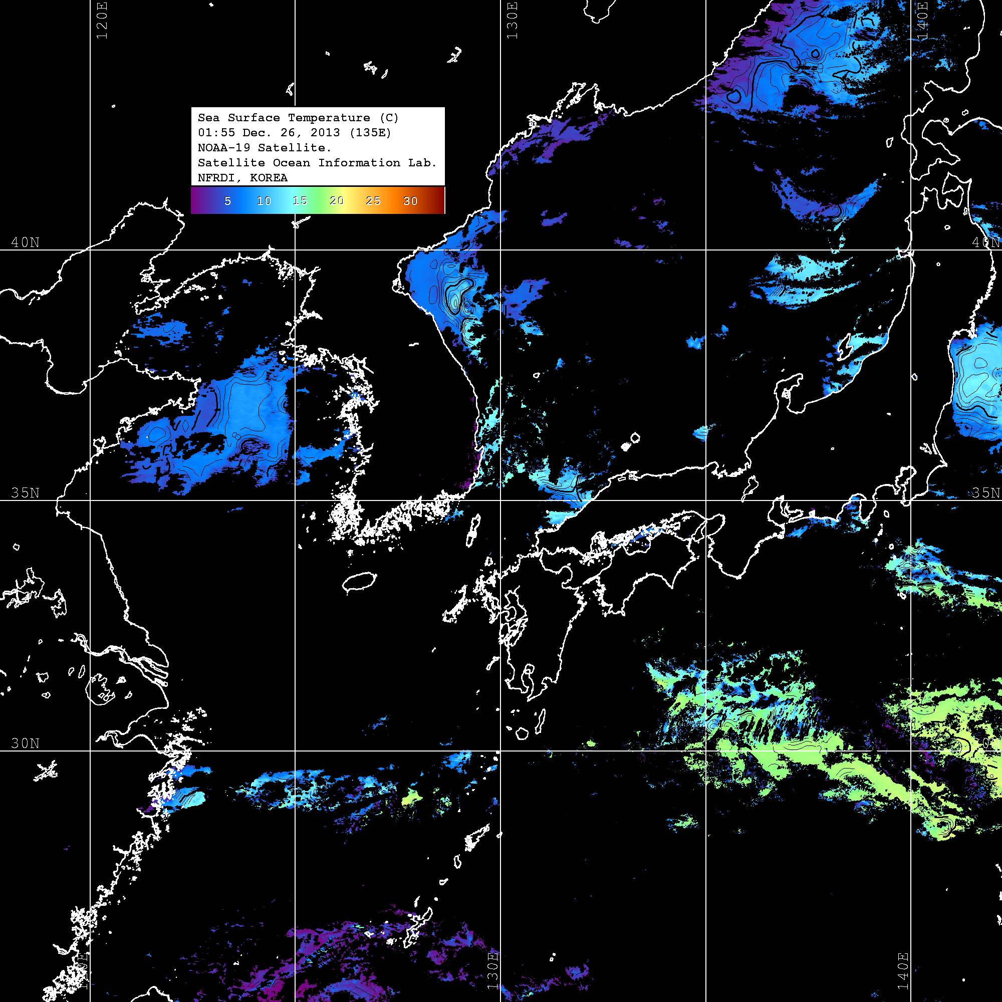 o 2013년 12월 26일 NOAA 위성영상입니다. o 영상 시간 및 수온분포는 범례를 참고하시기 바랍니다. o 검은색은 구름을 나타냅니다. o 그림을 클릭하시면 크게 보실 수 있습니다.
