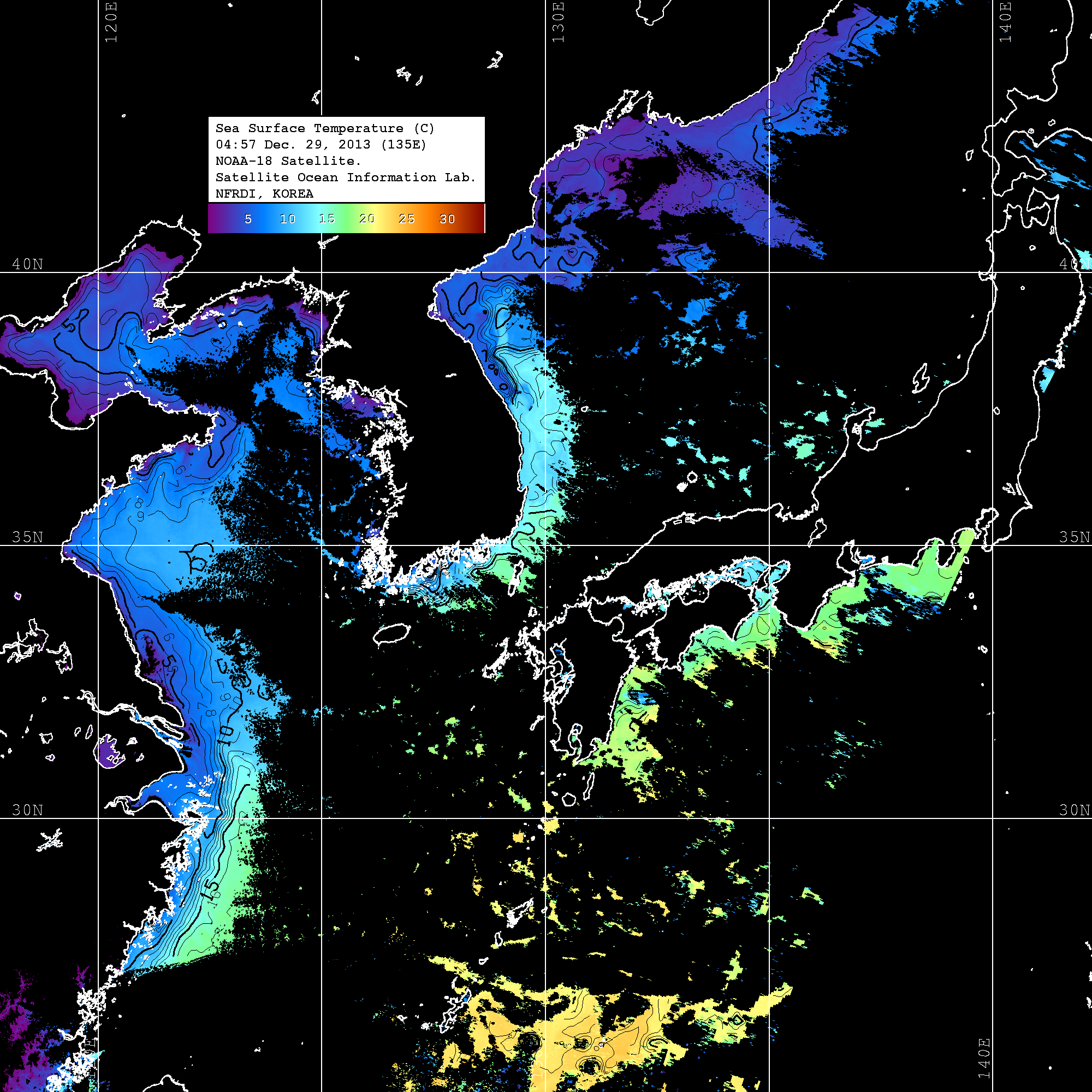 o 2013년 12월 29일 NOAA 위성영상입니다. o 영상 시간 및 수온분포는 범례를 참고하시기 바랍니다. o 검은색은 구름을 나타냅니다. o 그림을 클릭하시면 크게 보실 수 있습니다.