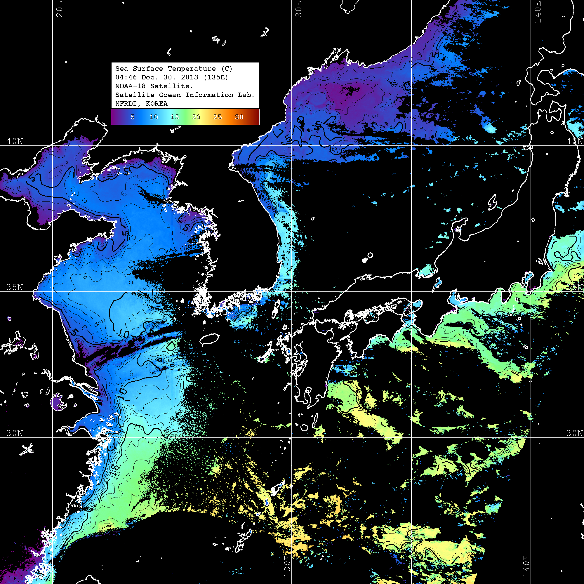 o 2013년 12월 30일 NOAA 위성영상입니다. o 영상 시간 및 수온분포는 범례를 참고하시기 바랍니다. o 검은색은 구름을 나타냅니다. o 그림을 클릭하시면 크게 보실 수 있습니다.