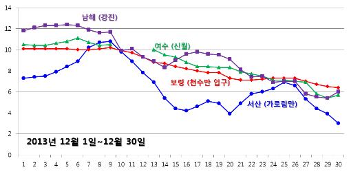 ◦ 국립수산과학원의 실시간 관측을 통한 12월 1일∼30일까지 서해 2개소 (서산 가로림만, 보령 천수만 입구)와 남해 2개소 (남해 강진, 여수 신월)의 자료 분석 결과, 수온 변동 경향은 아래와 같음.