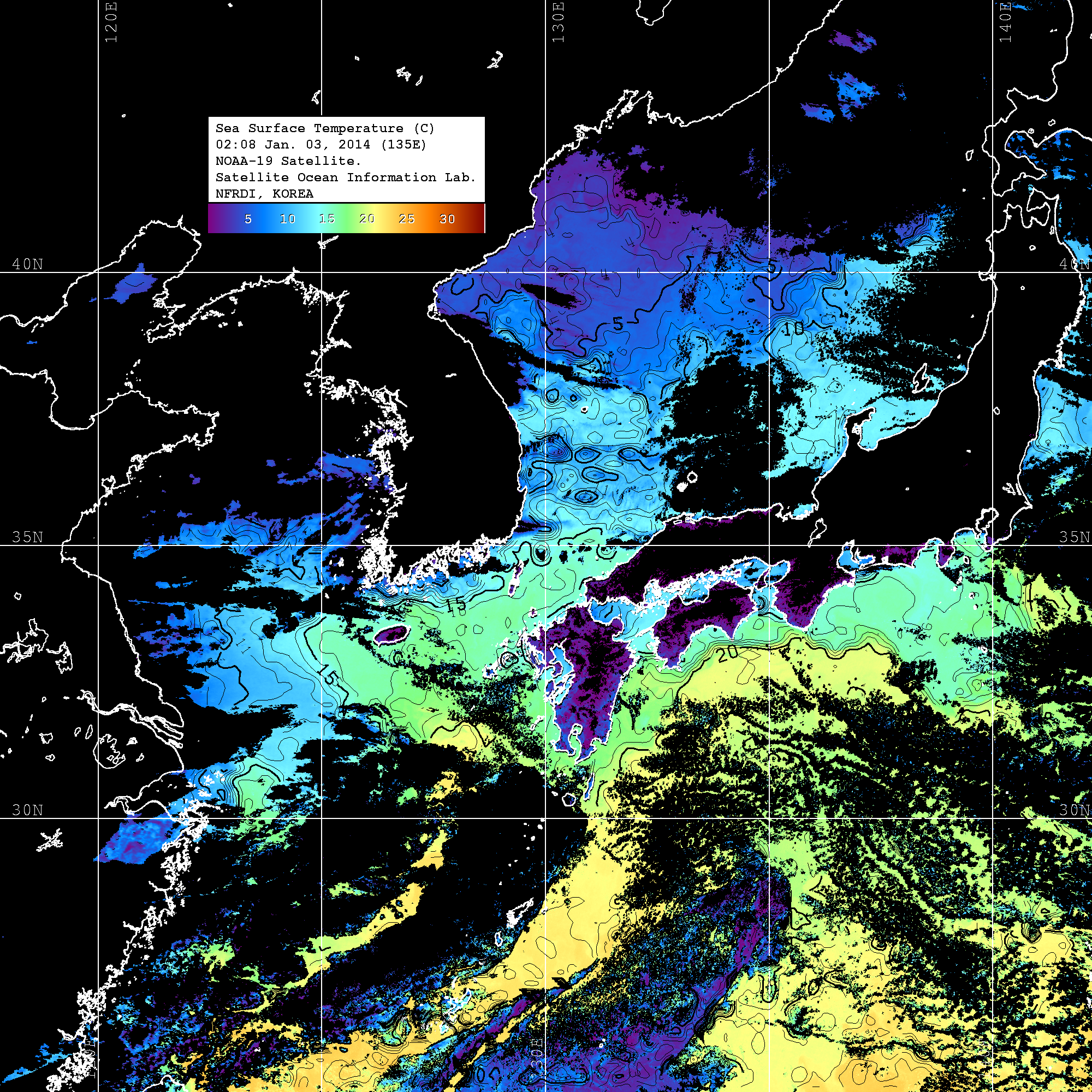 o 2014년 01월 03일 NOAA 위성영상입니다. o 영상 시간 및 수온분포는 범례를 참고하시기 바랍니다. o 검은색은 구름을 나타냅니다.