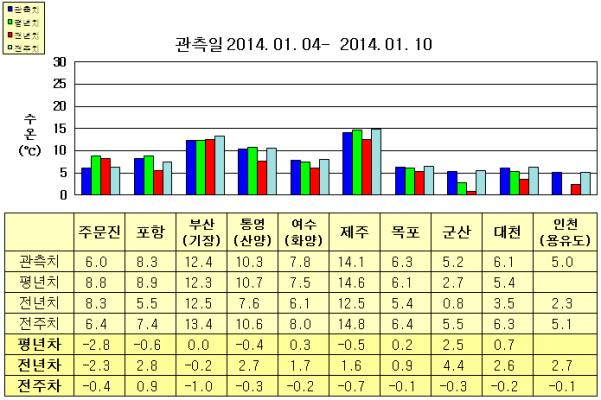 ◦ 금주(2014. 01. 04~2014. 01. 10)의 한반도 연안 표면수온은 동해 연안역에서 섭씨 6.0~12.5도, 남해 연안역 7.5~14.5도, 서해 연안역에서 5.0~6.5도로 나타납니다. ◦ 평년에 비해 부산(기장) 비슷함을 제외한 동해 연안역은 0.5~3.0도 낮게, 여수(화양) 비슷함을 제외한 남해 연안역은 0.5도 낮게, 목포 비슷함을 제외한 서해 연안역은 0.5~2.5도 높게 나타납니다. ◦ 전년에 비해 동해 연안역은 주문진 2.3도 낮게, 포항 2.8도 높게, 부산(기장)1.0~1.5도 높게, 남해 연안역은 1.5~3.0도 높게, 서해 연안역은 0.5~4.5도 높게 나타납니다. =$row['content']?> =$row['content']?> =$row['content']?> |