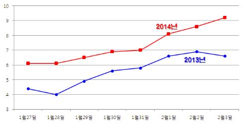 ◦ 국립수산과학원의 실시간 관측을 통한 여수 주변 해역 (여수 신월)의 최근 1주일 (1월 27일∼2월 3일) 수온 정보는 아래와 같음. ◦ 수온은 2월 3일 현재 9℃ 내외로 전년에 비하여 2.5℃ 내외, 평년에 비하여 1.5℃ 내외의 고수온을 나타내고 있음.