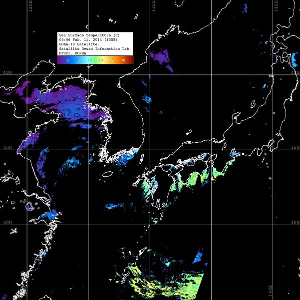 o 2014년 02월 11일 NOAA 위성영상입니다.o 영상 시간 및 수온분포는 범례를 참고하시기 바랍니다.o 검은색은 구름을 나타냅니다.o 그림을 클릭하시면 크게 보실 수 있습니다.
