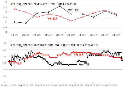 ◦ 부산 기장 및 거제 일운 해역의 최근 10일간 일일 표층수온 변화는 두 해역 모두 11∼13℃ 내외로 나타나고 있으며, 최근 3일간 30분 간격 표층수온 변화도 조석 등의 영향은 거의 나타나지 않으며 11.5∼12.5℃에서 변화하고 있음.