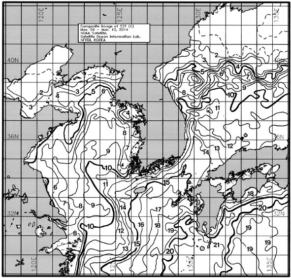 ◦ 금주(2014. 03. 04~2014. 03. 10)의 한국근해 표면수온은 대화퇴 근해 5~7도, 울릉도-독도 근해 10~11도, 대마도 근해 14~15도, 제주도 근해 14~15도, 이어도 근해 10~11도, 가거초 근해 11~12도, 어청도 근해 6~7도, 백령도 근해 5∼6도로 나타납니다. ◦「평년에 비해」대화퇴 근해 1도 낮게, 울릉도-독도 근해 1도 높게, 대마도 근해 0.6도 높게, 제주도 근해 0.8도 높게, 이어도 근해 1.3도 높게, 가거초 근해 2.6도 높게, 어청도 근해 1.5도 높게 나타납니다. ◦「전년에 비해」대화퇴 근해 1.5도 높게, 울릉도-독도 근해 1도 높게, 대마도 근해 1도 높게, 제주도 근해 비슷하게, 이어도 근해 2도 높게, 가거초 근해 3도 높게, 어청도 근해 1도 높게, 백령도 근해 2도 높게 나타납니다. ◦ 수온 전선대는 우리나라 제주해협에서 대한해협까지 14도를 중심으로 형성됩니다. =$row['content']?> =$row['content']?> =$row['content']?> |