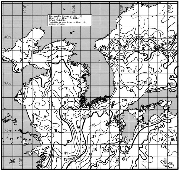 ◦ 금주(2014. 03. 11~2014. 03. 17)의 한국근해 표면수온은 대화퇴 근해 5~7도, 울릉도-독도 근해 10~11도, 대마도 근해 13~14도, 제주도 근해 14~15도, 이어도 근해 9~10도, 가거초 근해 10~11도, 어청도 근해 4~5도, 백령도 근해 3∼4도로 나타납니다. ◦「평년에 비해」대화퇴 근해 1도 낮게, 울릉도-독도 근해 1.1도 높게, 대마도 근해 비슷하게, 제주도 근해 0.5도 높게, 이어도 근해 0.7도 높게, 가거초 근해 2.1도 높게, 어청도 근해 0.7도 낮게 나타납니다. ◦「전년에 비해」대화퇴 근해 0.5도 높게, 울릉도-독도 근해 0.5도 높게, 대마도 근해 1도 낮게, 제주도 근해 0.5도 높게, 이어도 근해 2도 높게, 가거초 근해 3도 높게, 어청도 근해 2도 낮게, 백령도 근해 0.5도 낮게 나타납니다. ◦ 수온 전선대는 우리나라 제주해협에서 대한해협까지 13도를 중심으로 형성됩니다. =$row['content']?> =$row['content']?> =$row['content']?> |