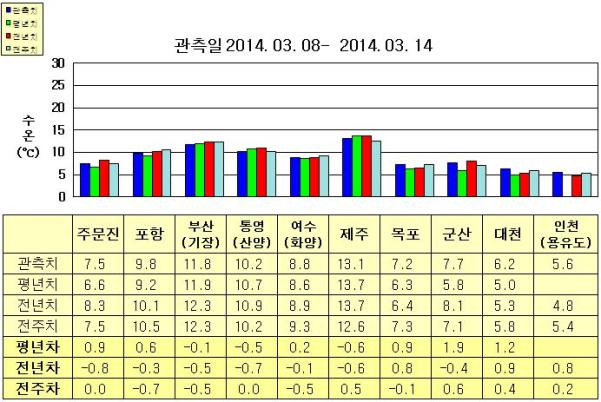 ◦ 금주(2014. 03. 08~2014. 03. 14)의 한반도 연안 표면수온은 동해 연안역에서 섭씨 7.5~12.0도, 남해 연안역 8.5~13.5도, 서해 연안역에서 5.5~8.0도로 나타납니다. ◦ 평년에 비해 부산(기장) 비슷함을 제외한 동해 연안역은 0.5~1.0도 높게, 여수(화양) 비슷함을 제외한 남해 연안역은 0.5~1.0도 낮게, 서해 연안역은 0.5~1.5도 높게 나타납니다. ◦ 전년에 비해 포항 비슷함을 제외한 동해 연안역은 0.5~1.0도 낮게, 여수(화양) 비슷함을 제외한 남해 연안역은 0.5~1.0도 낮게, 군산 0.4도 낮음을 제외한 서해 연안역은 1.0~1.0도 높게 나타납니다. =$row['content']?> =$row['content']?> =$row['content']?> |