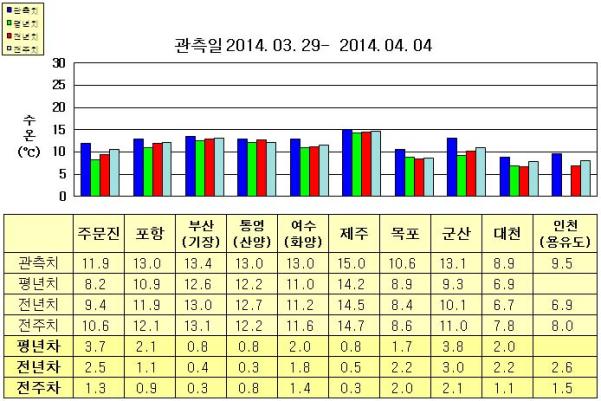 ◦ 금주(2014. 03. 29~2014. 04. 04)의 한반도 연안 표면수온은 동해 연안역에서 섭씨 11.5~13.5도, 남해 연안역 13~15도, 서해 연안역에서 8.5~13.5도로 나타납니다. ◦ 평년에 비해 동해 연안역은 0.5~4.0도 높게, 남해 연안역은 0.5~2.0도 높게, 서해 연안역은 1.5~4.0도 높게 나타납니다. ◦ 전년에 비해 동해 연안역은 0.5~2.5도 높게, 통영(산양) 비슷함을 제외한 남해 연안역은 0.5~2.0도 높게, 서해 연안역은 2~3도 높게 나타납니다. =$row['content']?> =$row['content']?> =$row['content']?> |