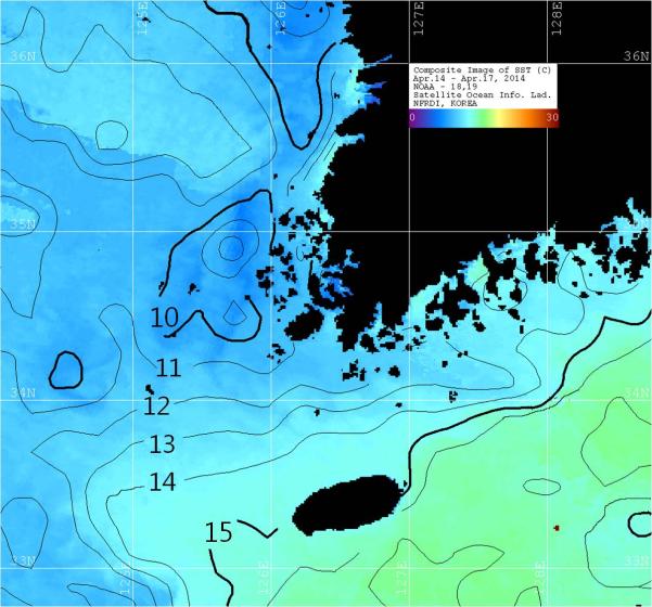 ◦ 국립수산과학원 위성해양정보실에서 2014년 4월 14 ~ 17일까지 NOAA위성 관측 표면수온자료를 분석한 영상입니다.