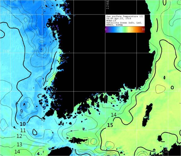 ◦ 2014년 4월 25일 04시 49분 NOAA위성으로 관측된 표면수온자료 영상입니다.