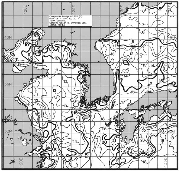 ◦ 금주(2014. 05. 06~2014. 05. 12)의 한국근해 표면수온은 대화퇴 근해 10~11도, 울릉도-독도 근해 14~15도, 대마도 근해 16~17도, 제주도 근해 16~17도, 이어도 근해 13~14도, 가거초 근해 13~14도, 어청도 근해 10~11도, 백령도 근해 8∼9도로 나타납니다. ◦「평년에 비해」대화퇴 근해 비슷하게, 울릉도-독도 근해 0.8도 높게, 대마도 근해 0.5도 높게, 제주도 근해 1.5도 높게, 이어도 근해 0.4도 낮게, 가거초 근해 1.7도 높게, 어청도 근해 0.4도 높게 나타납니다. ◦「전년에 비해」대화퇴 근해 3도 높게, 울릉도-독도 근해 비슷하게, 대마도 근해 비슷하게, 제주도 근해 1도 높게, 이어도 근해 2도 낮게, 가거초 근해 1도 높게, 어청도 근해 1도 높게, 백령도 근해 2도 높게 나타납니다. ◦ 수온 전선대는 우리나라 제주해협에서 대한해협까지 16도를 중심으로 형성됩니다. =$row['content']?> =$row['content']?> =$row['content']?> |