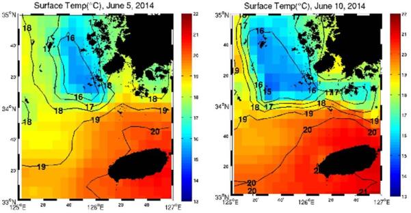 ◦ 국립수산과학원 해양변동 예측시스템을 기반으로 우리나라 남서부 해역에 대한 표층수온 자료를 예측한 결과입니다. ◦ 6월 상순은 표층수온이 점차 상승하여 15~20도의 수온분포를 보일 것으로 전망됩니다. - 진도주변 해역은 강한 조석에 의해 표층의 해수가 저층의 냉수와 연직혼합되어 저수온 분포가 나타나게 됩니다. ※ 우리나라 주변해역에 대한 수온 예측 정보는 한국해양자료센터 홈페이지 (http://kodc.nfrdi.re.kr/rocps) 에서도 이용하실 수 있습니다. (A) 2014년 6월 5일 예측 표면수온 (B) 2014년 6월 10일 예측 표면수온