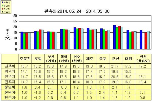 ◦ 금주(2014. 05. 24~2014. 05. 30)의 한반도 연안 표면수온은 동해 연안역에서 섭씨 15.5~16.5도, 남해 연안역 17.5~19.5도, 서해 연안역에서 17~22도로 나타납니다. ◦ 평년에 비해 부산(기장) 비슷함을 제외한 동해 연안역은 0.5~2.0도 높게, 통영(산양) 비슷함을 제외한 남해 연안역은 1~2도 높게, 서해 연안역은 1.0~2.5도 높게 나타납니다. ◦ 전년에 비해 동해 연안역은 주문진 1도 높게, 포항 1.3도 낮게, 부산(기장) 비슷하게 나타나며, 남해 연안역은 0.5~1.5도 높게, 서해 연안역은 1.0~2.5도 높게 나타납니다. =$row['content']?> =$row['content']?> =$row['content']?> |