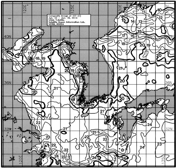 ◦ 금주(2014. 06. 10~2014. 06. 16)의 한국근해 표면수온은 대화퇴 근해 16~17도, 울릉도-독도 근해 20~21도, 대마도 근해 19~20도, 제주도 근해 20~21도, 이어도 근해 20~21도 가거초 근해 21~22도, 어청도 근해 18~19도, 백령도 근해 16∼17도로 나타납니다. ◦「평년에 비해」대화퇴 근해 1.1도 낮게, 울릉도-독도 근해 1.3도 높게, 대마도 근해 0.9도 낮게, 제주도 근해 비슷하게, 이어도 근해 0.6도 낮게, 가거초 근해 2.1도 높게, 어청도 근해 비슷하게 나타납니다. ◦「전년에 비해」대화퇴 근해 2.5도 낮게, 울릉도-독도 근해 비슷하게, 대마도 근해 1도 낮게, 제주도 근해 1도 높게, 이어도 근해 0.5도 높게, 가거초 근해 3도 높게, 어청도 근해 0.5도 높게, 백령도 근해 3도 높게 나타납니다. ◦ 수온 전선대는 우리나라 제주해협에서 대한해협까지 20도를 중심으로 형성됩니다. =$row['content']?> =$row['content']?> =$row['content']?> |