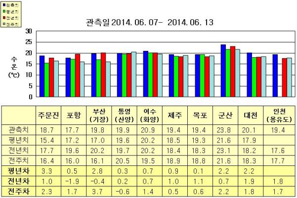 ◦ 금주(2014. 06. 07~2014. 06. 13)의 한반도 연안 표면수온은 동해 연안역에서 섭씨 17.5~20.0도, 남해 연안역 19~21도, 서해 연안역에서 19~24도로 나타납니다. ◦ 평년에 비해 동해 연안역은 0.5~3.5도 높게, 통영(산양) 비슷함을 제외한 남해 연안역은 0.5~1.0도 높게, 목포 비슷함을 제외한 서해 연안역은 2.0~2.5도 높게 나타납니다. ◦ 전년에 비해 주문진 1도 높음을 제외한 동해 연안역은 0.5~2.0도 낮게, 통영(산양) 비슷함을 제외한 남해 연안역은 0.5~1.0도 높게, 서해 연안역은 0.5~2.0도 높게 나타납니다. =$row['content']?> =$row['content']?> =$row['content']?> |