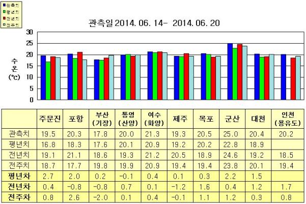 ◦ 금주(2014. 06. 14~2014. 06. 20)의 한반도 연안 표면수온은 동해 연안역에서 섭씨 17.5~20.5도, 남해 연안역 19.0~21.5도, 서해 연안역에서 20~25도로 나타납니다. ◦ 평년에 비해 부산(기장) 비슷함을 제외한 동해 연안역은 2~3도 높게, 여수(화양) 0.4도 높음을 제외한 남해 연안역은 비슷하게, 목포 비슷함을 제외한 서해 연안역은 1.5~2.5도 높게 나타납니다. ◦ 전년에 비해 주문진 0.4도 높음을 제외한 동해 연안역은 0.5~1.0도 낮게, 남해 연안역은 통영(산양) 0.7도 높게, 여수(화양) 비슷하게, 제주 1.2도 낮게 나타나며, 서해 연안역은 0.5~2.0도 높게 나타납니다. =$row['content']?> =$row['content']?> =$row['content']?> |