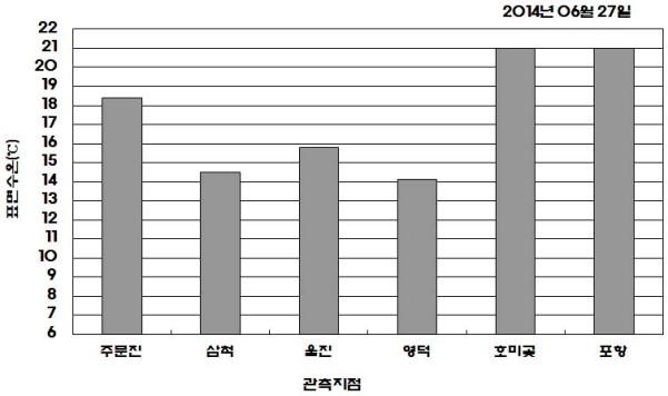 ◦ 아래 그림은 2014년 06월 27일 오전 10시에 관측된 현장 표면수온 분포입니다.