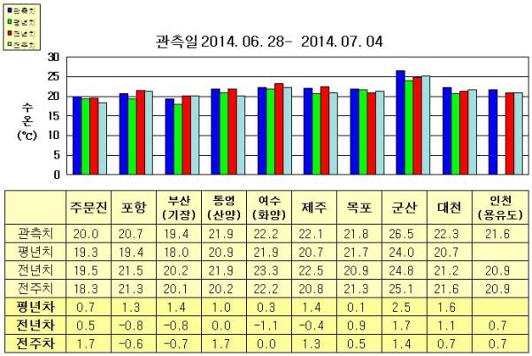 ◦ 금주(2014. 06. 28~2014. 07. 04)의 한반도 연안 표면수온은 동해 연안역에서 섭씨 19~22도, 남해 연안역 21.5~22.5도, 서해 연안역에서 21.5~26.5도로 나타납니다. ◦ 평년에 비해 동해 연안역은 0.5~2.5도 높게, 여수(화양) 비슷함을 제외한 남해 연안역은 1.0~1.5도 높게, 목포 비슷함을 제외한 서해 연안역은 1.5~2.5도 높게 나타납니다. ◦ 전년에 비해 동해 연안역은 주문진 0.5도 높게, 포항 비슷하게, 부산(기장) 0.8도 낮게 나타나며, 통영(산양) 비슷함을 제외한 남해 연안역은 0.5~1.5도 낮게, 서해 연안역은 0.5~2.0도 높게 나타납니다. =$row['content']?> =$row['content']?> =$row['content']?> |