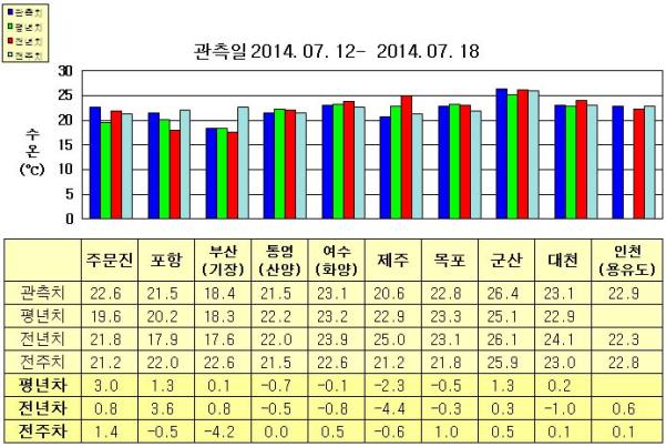 ◦ 금주(2014. 07. 12~2014. 07. 18)의 한반도 연안 표면수온은 동해 연안역에서 섭씨 18~23도, 남해 연안역 20.5~23.5도, 서해 연안역에서 22.5~26.5도로 나타납니다. ◦ 평년에 비해 부산(기장) 비슷함을 제외한 동해 연안역은 1~3도 높게, 여수(화양) 비슷함을 제외한 남해 연안역은 0.5~2.5도 낮게, 서해 연안역은 목포 0.5도 낮게, 군산 1.3도 높게, 대천 비슷하게 나타납니다. ◦ 전년에 비해 동해 연안역은 0.5~4.0도 높게, 남해 연안역은 0.5~4.5도 낮게, 대천1도 낮게, 인천(용유도) 0.6도 높음을 제외한 서해 연안역은 비슷하게 나타납니다. =$row['content']?> =$row['content']?> =$row['content']?> |