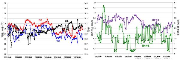◦ 외나로도 남방 해양기상관측부이에는 기온, 기압, 풍향/풍속 등 기상요소와 수온, 염분, 용존산소, 클로로필, 유향/유속 등 해양요소를 동시에 측정하고 있음. ◦ 7월 23∼27일간 수온은 22∼26℃, 기온은 23∼27℃, 염분은 33.6∼34.2의 범위였으며, 용존산소 는 7.5∼8.5(㎎/ℓ), 클로로필-a는 0.3∼4.5(㎍/ℓ)의 범위로 나타나고 있음.