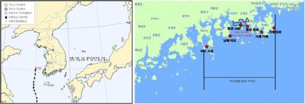 ◦ 지난 8월 2∼3일에 제 12호 태풍 나크리의 통과로 인한 적조생물 출현주의보 해역(여수∼거제, 7.24∼)과 적조주의보 발령해역 (고성만 주변, 7.31∼)의 수온변동을 국립수산과학원 실시간 어장환경정보시스템을 통해 살펴봄.