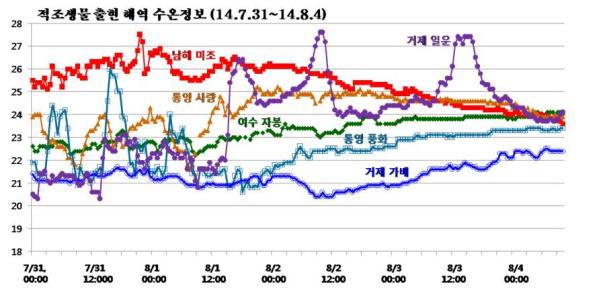 ◦ 태풍의 영향이 가장 강했던 8월 2일경을 경계로 1∼2℃ 수온이 하강한 해역 (남해 미조, 통영 사량 등)과 1∼2℃ 수온이 상승한 해역 (여수 자봉, 통영 풍화, 거제 가배, 거제 일운 등)이 나타남. ◦ 8월 4일, 10:00 현재 적조주의보 발령 인근해역인 통영 사량은 24℃ 내외, 통영 풍화는 23.5℃ 내외의 수온을 나타내고 있음 |