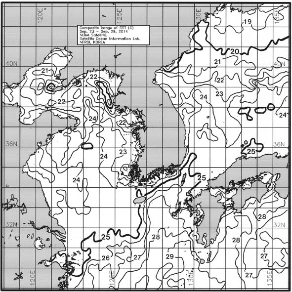 ◦ 금주(2014. 09. 23~2014. 09. 29)의 한국근해 표면수온은 대화퇴 근해 22~23도, 울릉도-독도 근해 24~25도, 대마도 근해 25~26도, 제주도 근해 24~25도, 이어도 근해 24~25도, 가거초 근해 23~24도, 어청도 근해 22~23도, 백령도 근해 19∼20도로 나타납니다. ◦ 「평년에 비해」대화퇴 근해 1.4도 높게, 울릉도-독도 근해 2도 높게, 대마도 근해 0.4도 높게, 제주도 근해 비슷하게, 이어도 근해 비슷하게, 가거초 근해 0.8도 높게, 어청도 근해 1도 높게 나타납니다. ◦「전년에 비해」대화퇴 근해 0.5도 높게, 울릉도-독도 근해 0.5도 낮게, 대마도 근해 2도 낮게, 제주도 근해 1.5도 낮게, 이어도 근해 3도 낮게, 가거초 근해 1.5도 낮게, 어청도 근해 1도 낮게, 백령도 근해 1도 높게 나타납니다. ◦ 수온 전선대는 우리나라 제주해협에서 대한해협까지 25도를 중심으로 형성됩니다. =$row['content']?> =$row['content']?> =$row['content']?> |