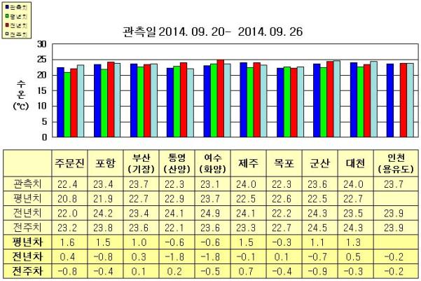 ◦ 금주(2014. 09. 20~2014. 09. 26)의 한반도 연안 표면수온은 동해 연안역에서 섭씨 22~24도, 남해 연안역 22~24도, 서해 연안역에서 22~24도로 나타납니다. ◦ 평년에 비해 동해 연안역은 1~2도 높게, 제주 1.5도 높음을 제외한 남해 연안역은 0.6도 낮게, 목포 비슷함을 제외한 서해 연안역은 0.5~1.5도 높게 나타납니다. ◦ 전년에 비해 동해 연안역은 주문진 0.4도 높게, 포항 0.8도 낮게, 부산(기장) 비슷하게 나타나며, 제주 비슷함을 제외한 남해 연안역은 1.8도 낮게, 서해 연안역은 목포, 인천(용유도) 비슷하게, 군산 0.7도 낮게, 대천 0.5도 높게 나타납니다. =$row['content']?> =$row['content']?> =$row['content']?> |