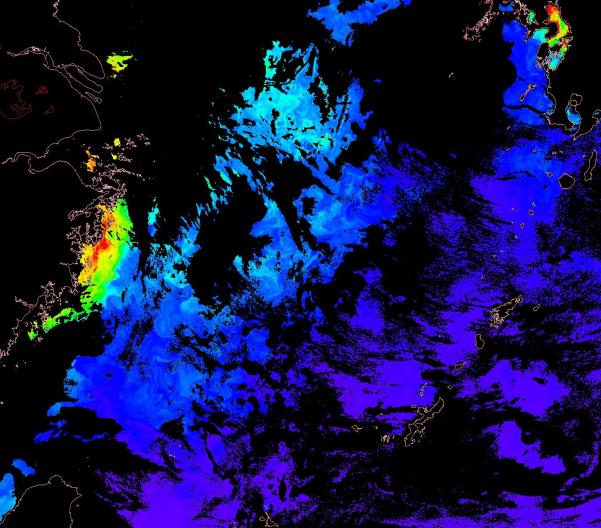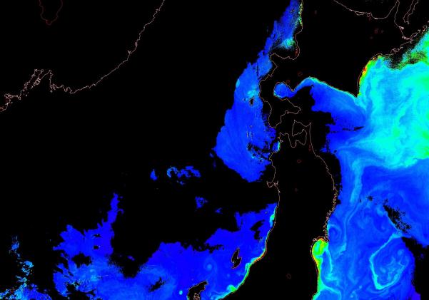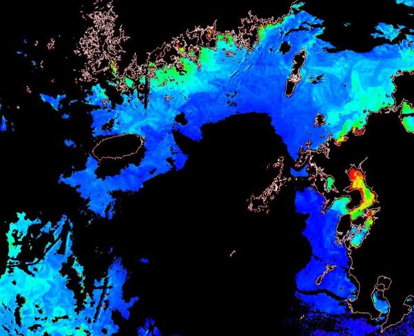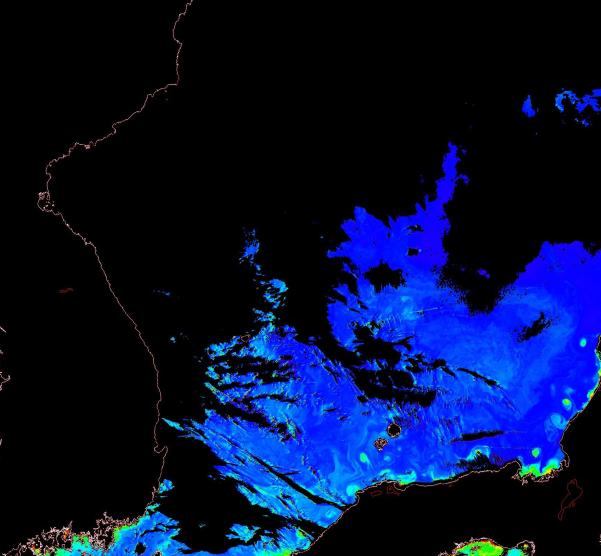 o 2014년 10월 19일 천리안 GOCI 위성영상입니다. [ GOCI : Geostationary Ocean Color Imager ] o 농도분포는 하단 범례를 참고하시기 바랍니다. o 검은색은 구름을 나타냅니다. o 그림을 클릭하시면 크게 보실 수 있습니다. o 천리안 GOCI 클로로필 a 동해지역. o 천리안 GOCI 클로로필 a 서해지역. o 천리안 GOCI 클로로필 a 남해지역. o 천리안 GOCI 클로로필 a 동중국해지역.