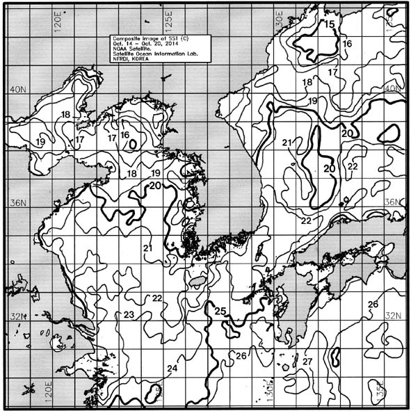 ◦ 금주(2014. 10. 14~2014. 10. 20)의 한국근해 표면수온은 대화퇴 근해 20~21도, 울릉도-독도 근해 20~21도, 대마도 근해 22~24도, 제주도 근해 21~23도, 이어도 근해 22~23도, 가거초 근해 20~22도, 어청도 근해 19~20도, 백령도 근해 16∼17도로 나타납니다.