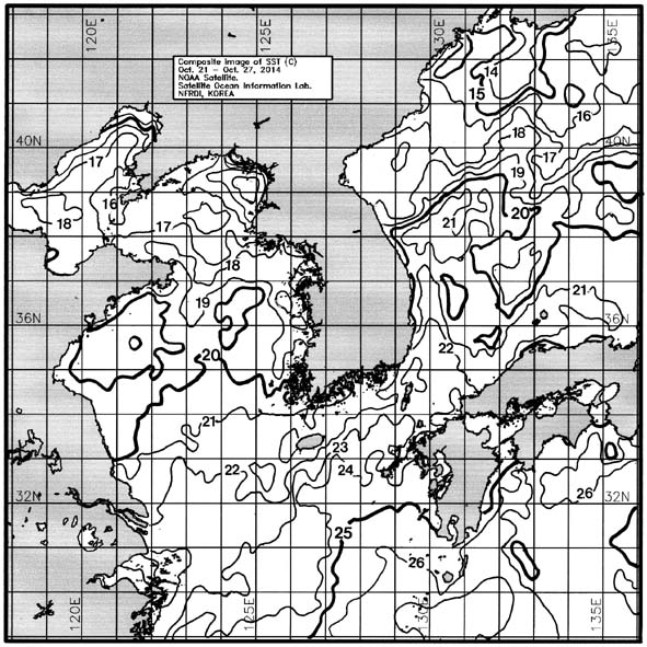 ◦ 금주(2014. 10. 21~2014. 10. 27)의 한국근해 표면수온은 대화퇴 근해 19~20도, 울릉도-독도 근해 19~21도, 대마도 근해 22~23도, 제주도 근해 21~22도, 이어도 근해 22~23도, 가거초 근해 20~22도, 어청도 근해 18~19도, 백령도 근해 16∼17도로 나타납니다. ◦ 「평년에 비해」대화퇴 근해 1.8도 높게, 울릉도-독도 근해 0.6도 높게, 대마도 근해 비슷하게, 제주도 근해 비슷하게, 이어도 근해 0.5도 높게, 가거초 근해 1.9도 높게, 어청도 근해 0.9도 높게 나타납니다. ◦「전년에 비해」대화퇴 근해 2.5도 높게, 울릉도-독도 근해 0.5도 낮게, 대마도 근해 0.5도 낮게, 제주도 근해 2도 낮게, 이어도 근해 1도 낮게, 가거초 근해 0.5도 낮게, 어청도 근해 0.5도 높게, 백령도 근해 0.5도 높게 나타납니다. ◦ 수온 전선대는 우리나라 제주해협에서 대한해협까지 22도를 중심으로 형성됩니다 |